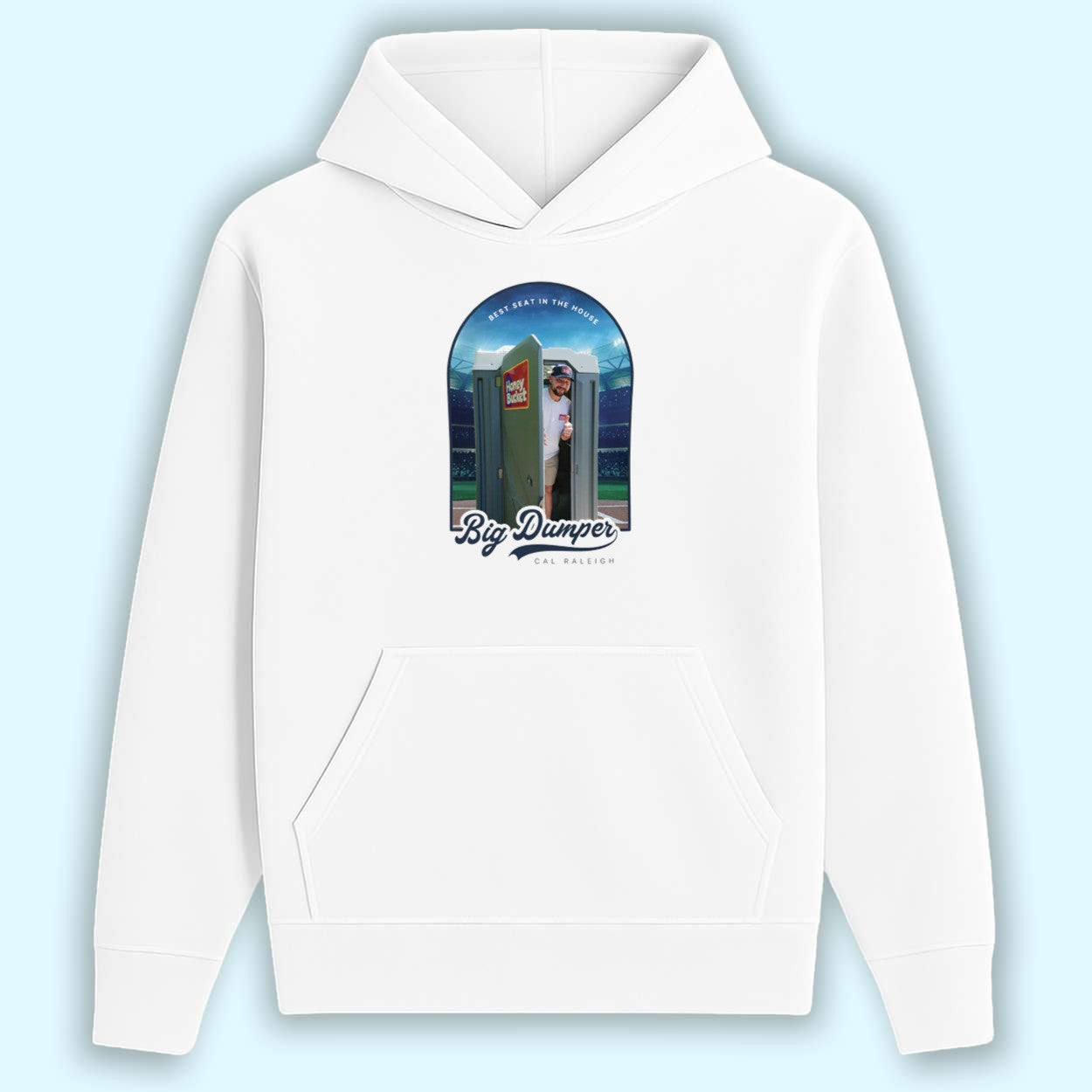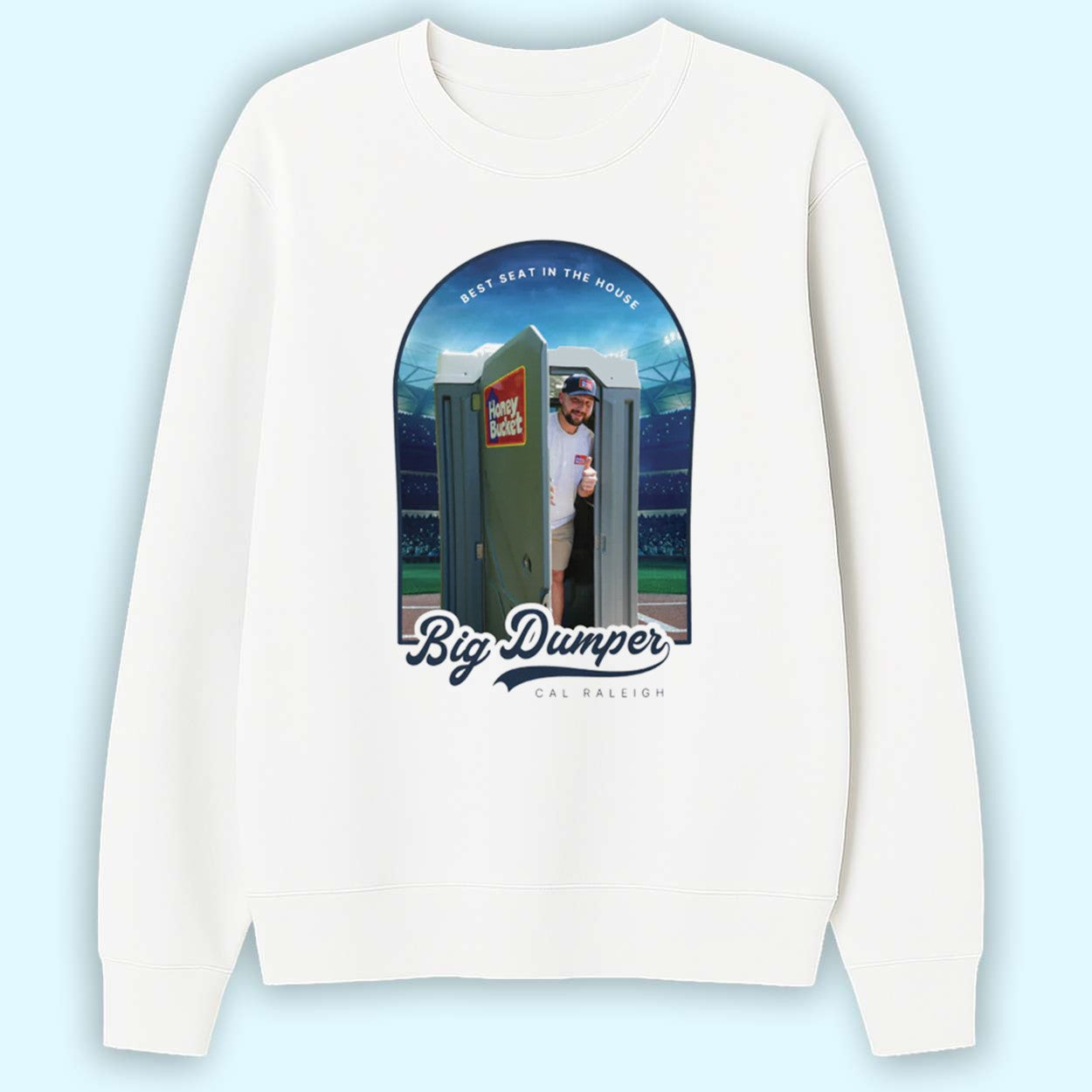 This Cal Raleigh Big Dumper Best Seat In The House Shirt features a bold, graphic print of the famous image: Cal "Big Dumper" Raleigh emerging from a portable toilet with a thumbs-up, framed by the words "BEST SEAT IN THE HOUSE". The background shows the ballpark, adding a touch of authenticity to the scene. The graphic also includes the text "Big Dumper" in a flowing script and "CAL RALEIGH" below it. The high-resolution print captures the details of the scene perfectly, from the "Honey Bucket" logo to Cal's mischievous smile.