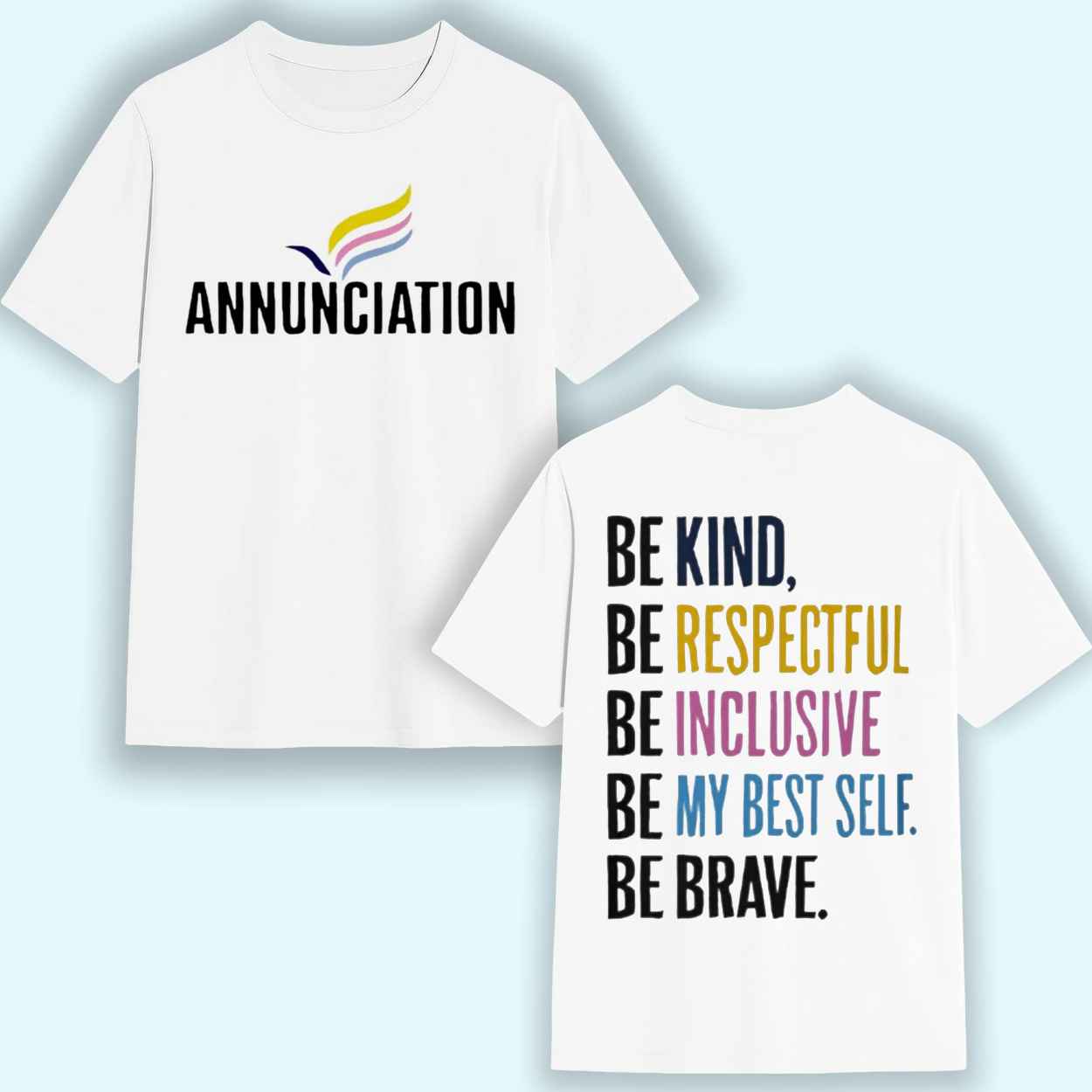 This Isaiah Rodgers Vikings Annunciation Shirt features a dynamic two-sided design. The front proudly displays the bold, black lettering of "ANNUNCIATION" alongside a stylized logo featuring vibrant streaks of blue, yellow, and pink. This design represents the "Annunciation of the Lord," the feast day of the Vikings' patron saints, connecting your fan pride to a deeper tradition. The real highlight, however, is on the back. It features a powerful, stacked message in a mix of bold black and colored fonts: "BE KIND, BE RESPECTFUL, BE INCLUSIVE, BE MY BEST SELF. BE BRAVE." Each line is a call to action, with the phrase "BE MY BEST SELF" in a striking blue font, and "BE RESPECTFUL" in yellow, mirroring the front logo's colors.