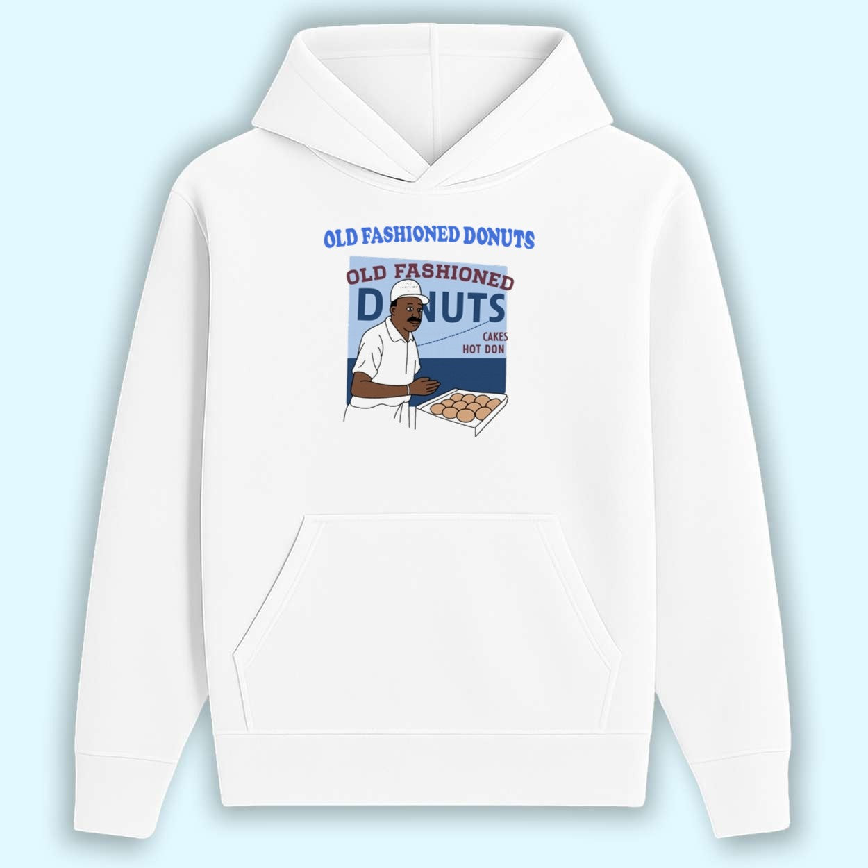 This Jason Kelce Wearing Old Fashioned Donuts Shirt features a striking and fun graphic. The design showcases a cartoon-style man, seemingly a donut vendor, holding a tray of freshly baked donuts. The background is a clean blue and white, with the words "OLD FASHIONED DONUTS" boldly printed above and below the illustration in a distressed font. The phrase is a hilarious and beloved pop culture reference, connecting you to a fun and memorable moment.