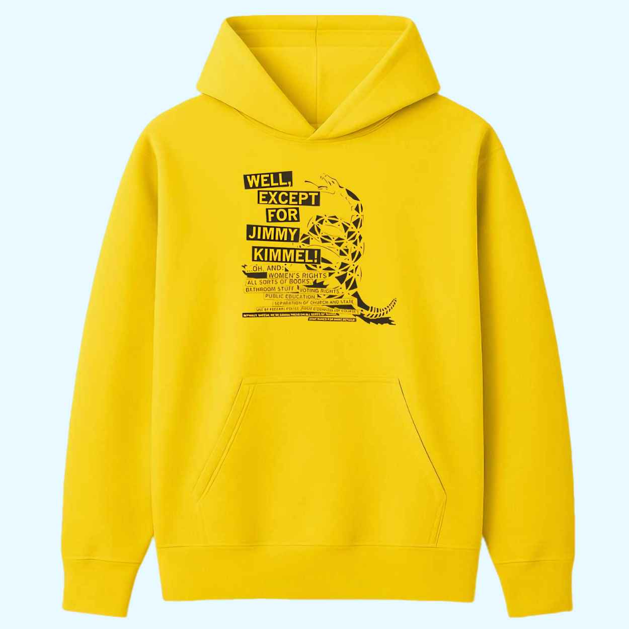 The front of the shirt features a powerful and humorous graphic. The main design is a Gadsden flag-style rattlesnake, a classic symbol of American libertarianism and a call for individual rights. Across the top, the bold text "WELL, EXCEPT FOR JIMMY KIMMEL!" is prominently displayed. The shirt serves as a piece of commemorative apparel that encapsulates a specific moment in modern political discourse. It represents a a common sentiment of those who feel that Jimmy Kimmel's humor and political commentary have crossed a line, and it's a humorous and satirical take on that feeling. This shirt is a nod to a shared sense of humor and a clear signal of your political perspective.